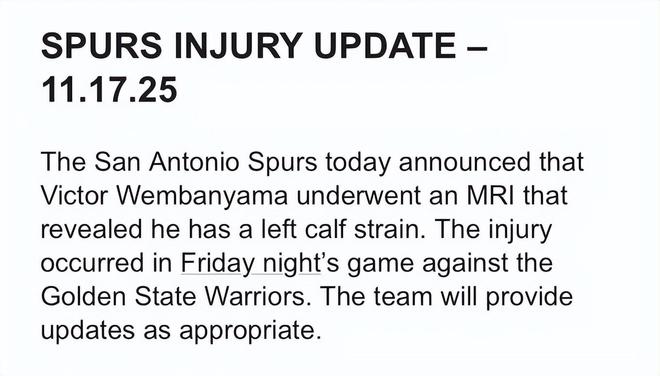 马刺记者Wright在社媒上写道:“昨晚在更衣室看到了文班亚马,他受伤的小腿上套了个小护套。看起来他没什么不适,精神状态也不错。但大家都知道,马刺队总是会格外谨慎——尤其是在小腿拉伤这种情况下。”